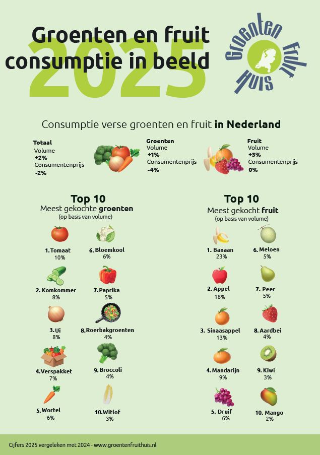 Bij de groenten staat tomaat opnieuw bovenaan met 10% van het totale aankoopvolume van verse groenten. Daarna volgen komkommer (8%), ui (8%), verspakketten (7%) en wortel (6%). Ook producten als bloemkool, paprika, roerbakgroenten, broccoli en witlof staan in de top tien. Daarmee blijft het groenteassortiment dat consumenten kopen breed en gevarieerd.